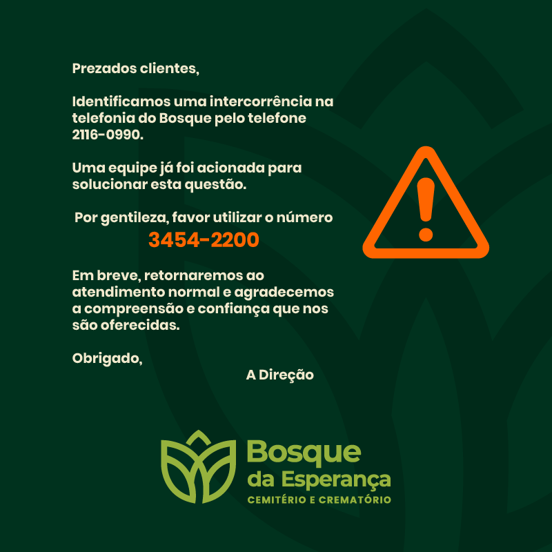 O Bosque da Esperança Cemitério Parque está localizado na R. Aldemiro Fernandes Tôrres, 1500, no Jaqueline, em BH. Com uma área total de 500.000 metros quadrados e 70.000 de bosque natural e preservado, o Cemitério tem a capacidade de receber até 1.000 carros em sua área própria de estacionamento, oferecendo todo conforto e segurança aos clientes. Para mais informações, entre em contato (31) 3454-2200.